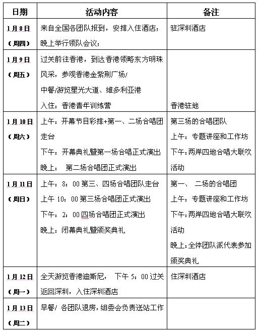 为繁荣和发展青少年儿童文化艺术事业, 促进青少年儿童思想道德教育和素质教育的提高,发展我国的童声合唱事业,由中国合唱协会、中国教育学会音乐教育专业委员会、香港新苗国际文化交流有限公司主办,中国合唱协会童声合唱委员会、深圳市新苗文化开发有限公司承办的“第四届中国童声合唱节”定于2009年1月8日~13日在香港举行。本次活动将会是汇聚两岸四地优秀童声合唱团和优秀童声合唱经典作品的盛会。本次活动将为所有参与团队提供一个展现风采,交流提高,相互欣赏学习的平台。 一、组织机构: 主办单位:中国合唱协会 中国教育学会音乐教育专业委员会 香港新苗国际文化交流有限公司 承办单位:中国合唱协会童声合唱委员会 深圳市新苗文化开发有限公司 二、活动时间:2009年1月8日—13日 三、展演地点:香港屯门大会堂(或同级) 四、活动内容: 1、音乐厅合唱展演; 2、两岸四地合唱交流; 3、童声合唱专家及优秀合唱团的专题讲座和工作坊; 4、部分节目进入香港迪斯尼演出; 5、参观及游览香港知名文化景点。 五、报名须知: 1.报名条件: A、全国(含港、澳、台地区)各省市中小学及少年宫等优秀童声合唱团均可自愿报名参加初选。 B. 由中国合唱协会童声合唱委员会各地委员推荐参加初选。 2.分设组别: A、儿童合唱组(12岁或以下) B、少年组(12岁—18岁) 各组合唱团人数:30—60人 3.报名方式:填写报名表,回传组委会 4.报名截止时间:2008年10月20日前 六、专家委员会: 由中国合唱协会童声合唱专家组成。 七、奖项设置: 专家委员会将本着淡化比赛,重在参与的原则对参演团体进行评定,对参演合唱团和参演的优秀合唱团颁发奖杯、证书 八、报名程序: 分为初选、展演二个阶段 1.报名单位请于2008年9月30日前将表演团队的录像资料报送北京中国合唱协会童声合唱委员会进行初步评选。经专家资格审查进行初选。结果将于一周内下达正式通知告各合唱团。 2.参演作品一至二首(中、外乐曲不限)、演唱时间不超过10分钟。 3.报名单位如进入展演,需向组委会提供艺术团简介及团队演出剧照二张、指挥教师简介及照片一张、展演节目时间等用于制作场刊; 九、活动具体行程见附件 十、组委会联系方式: 中国合唱协会: 夏婉娴 马伟营 刘燕 地址:北京和平街11区1号 邮编:100013 TEL: 010-64276240 FAX: 010-64289973 邮箱:cca135@sina.com 网址:cca135.com/ 香港联系人:唐老师 地 址:香港九龙新码头街38号翔龙湾2座41E 咨询电话 :00852-65597052 00852-90699946 传 真:00852-22622726 深圳联系人:郭老师、袁老师 ADDRESS:深圳市南山区南商路华英大厦C102(518045) TEL:0755-26641752 26642012 26415505 FAX:0755-26409672